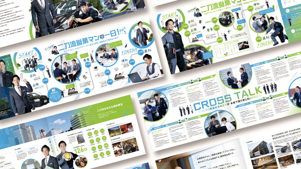 営業と施工の2つの技術が身につくことを伝える表紙に。仕事内容がより具体的にイメージできるよう、入社後の流れを新入社員の視点で展開しました。さらに会社の魅力を伝えるために、仕事内容や仕事への想いをクロストークで語っていただきました。