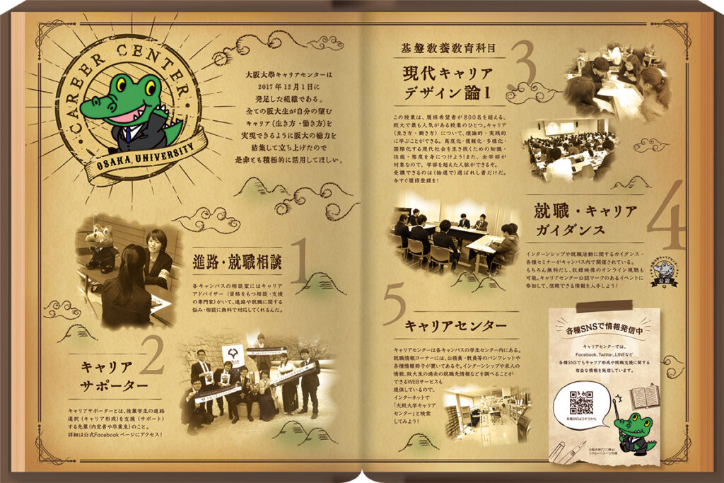 新入生を対象に、認知拡大を目的とする資料を配布することに。入学式で配布される膨大な資料の中で見落とされないためにインパクトのあるカタチとデザインに。入学してすぐに就活の話しをするのは学生にとって負担になるため、手に取ったときにワクワク感を感じてもらい。これからの学校生活へのワクワク感を損なわないようにしました。